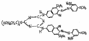 答:笔者亲自也曾遇到过这种疵病的产生,并且还看到,听到发生在人家厂里的这种疵病。实际上这种疵病是织物在卷染机上染色后,含水量过高就直接到烘筒(锡林)上去烘干而使染着在织物上的染料产生泳移所致。因为直接混纺(D-型)染料的化学分子结构通常比其它直染料的分子结构要大得多,它在分子结构中主要有三嗪环的存在(图1),所以前者的色牢度要比后者显著提高(表1),实验说明,图1中两只染料在完全相同的深度和工艺条件下进行染色,结果前者虽然色泽鮮艳,但得色率仅为后者的66.287%,这充分说明要提高分散环保NP系列的得色率是要相应延长保溫染色时间,尽量在染色过程中让具有立体结构的染料分子和线形的纤维素纤维有更多的结合几率,从而提高得色,达到动态平衡。从理论上讲,直接(混纺)染料与棉纤维的结合有许多机理,但主要是范德华力和氢键结合力,纤维素纤维的主价键的键能为50千卡/克分子,而氢键的键能一般是4~10千卡/克分子;范德华力的引力及电荷的替代其作用是非常重要的。換句话说,在染浴中加入一定数量的电介质(NaCL、Na2SO4)对促使染料上染是至关重要的,否则,既不能体现出分散环保NP系列的优越性,如果再加之水洗不净,浮色较多是很容易在烘干过程中产生色花的。此外,实践还证明,可以采取以下措施得到避免: