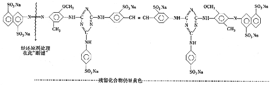 实践证明,这些染料中,双偶氮和三偶氮结构的染料较容易剥色,但单偶氮结构的却很难剥尽,所以采用这些染料染色只能一次染成。以下是黄D-3RNL的化学结构式: